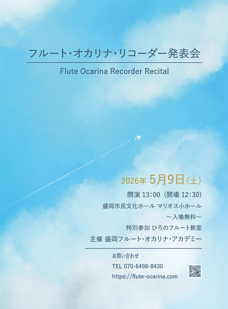 NEW!発表会のご案内 新着情報 2026.04.01 2026年5月9日(土)開場:12:30開演:13:00場所:盛岡市民文化ホールマリオス小ホール入場料:無料 どなたでもお入りいただけます。皆様のお越しをお待ちしております。